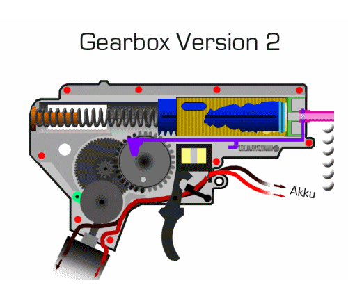 Основную роль при выполнении стрельбы из электропневматического привода (AEG) выполняет часть привода, именуемая гирбоксом (gearbox).